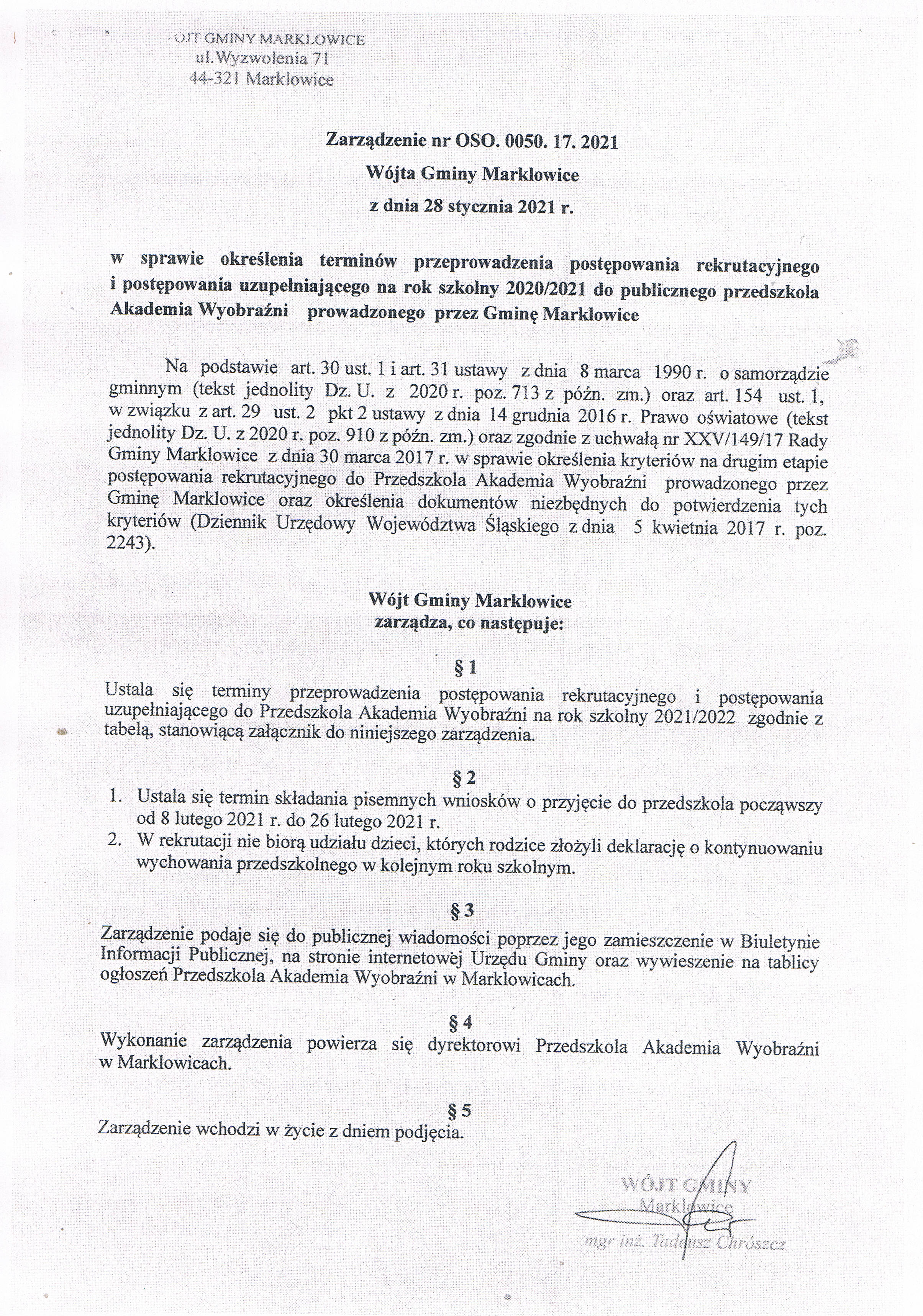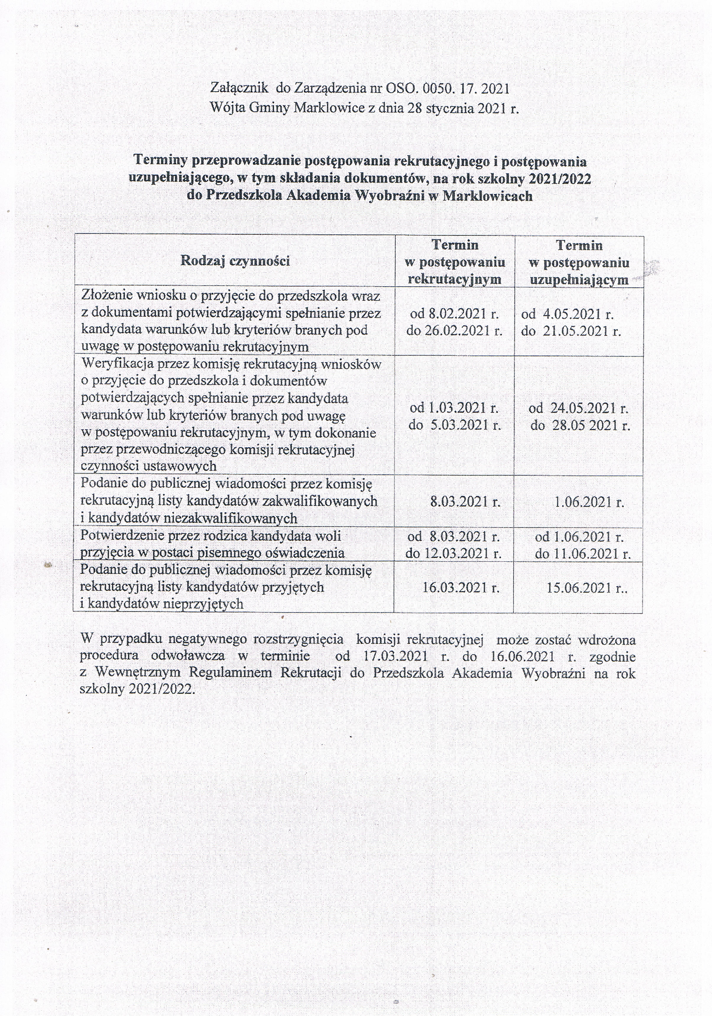 Plik zawiera Zarządzenie Wójta i terminy rekrutacj. Wielkość pliku 625KB.